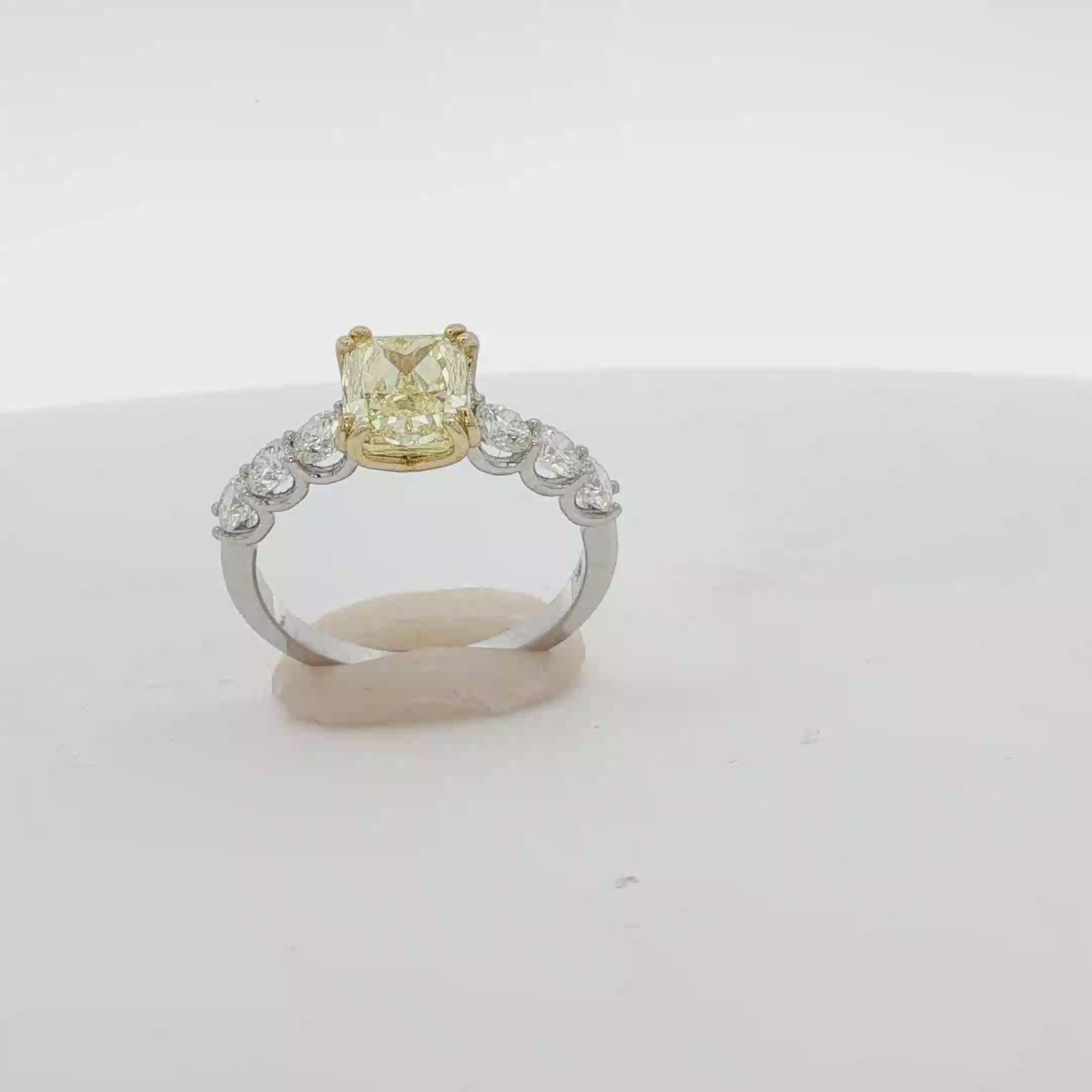 This elegant One of a kind ring showcases a mesmerizing GIA 1.71 Fancy yellow VVS1 cushion cut diamond along 6 brilliant cut diamonds . The Yellow gold complements the unique character of the cushion cut diamond, creating a luxurious and sophisticated look while the white gold looks natural with the white diamonds . This ring embodies timeless beauty and refined craftsmanship.