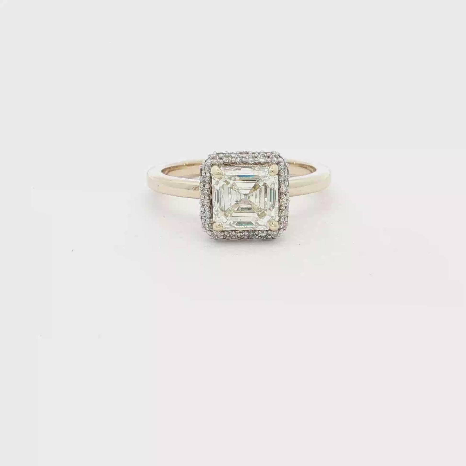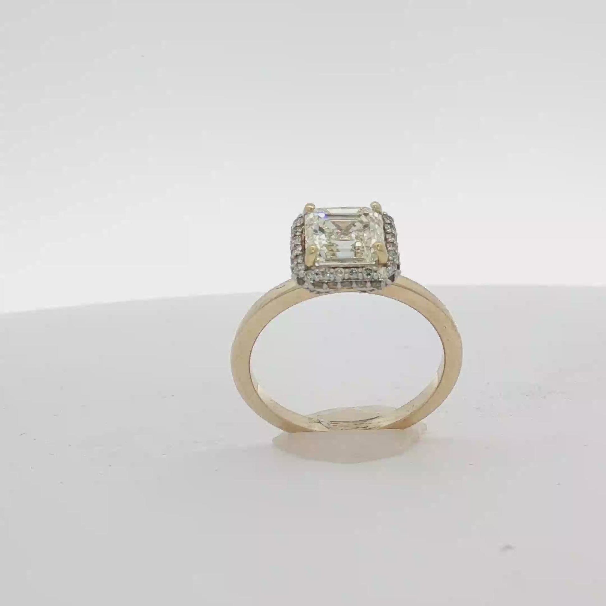 Exquisite yellow gold engagement ring showcasing a square 1.71 CT colorless diamond with .32 whire side pave diamonds . The Asher diamond, renowned for its transparency , cut, and brilliance, is meticulously set to enhance its natural fire and scintillation, promising a lifetime of sparkle and admiration. A timeless piece designed for enduring love.