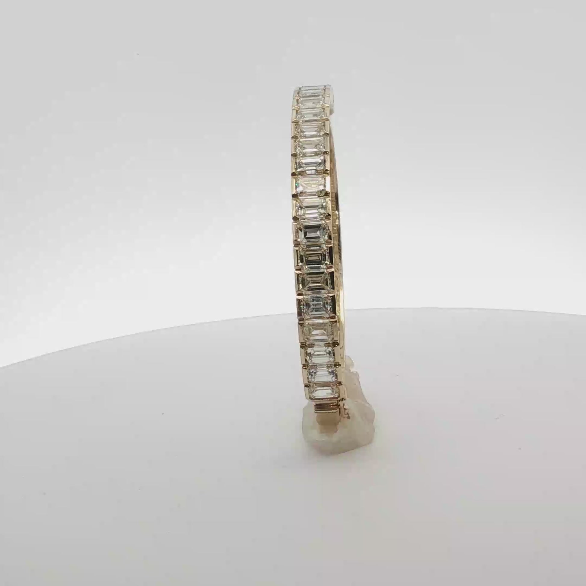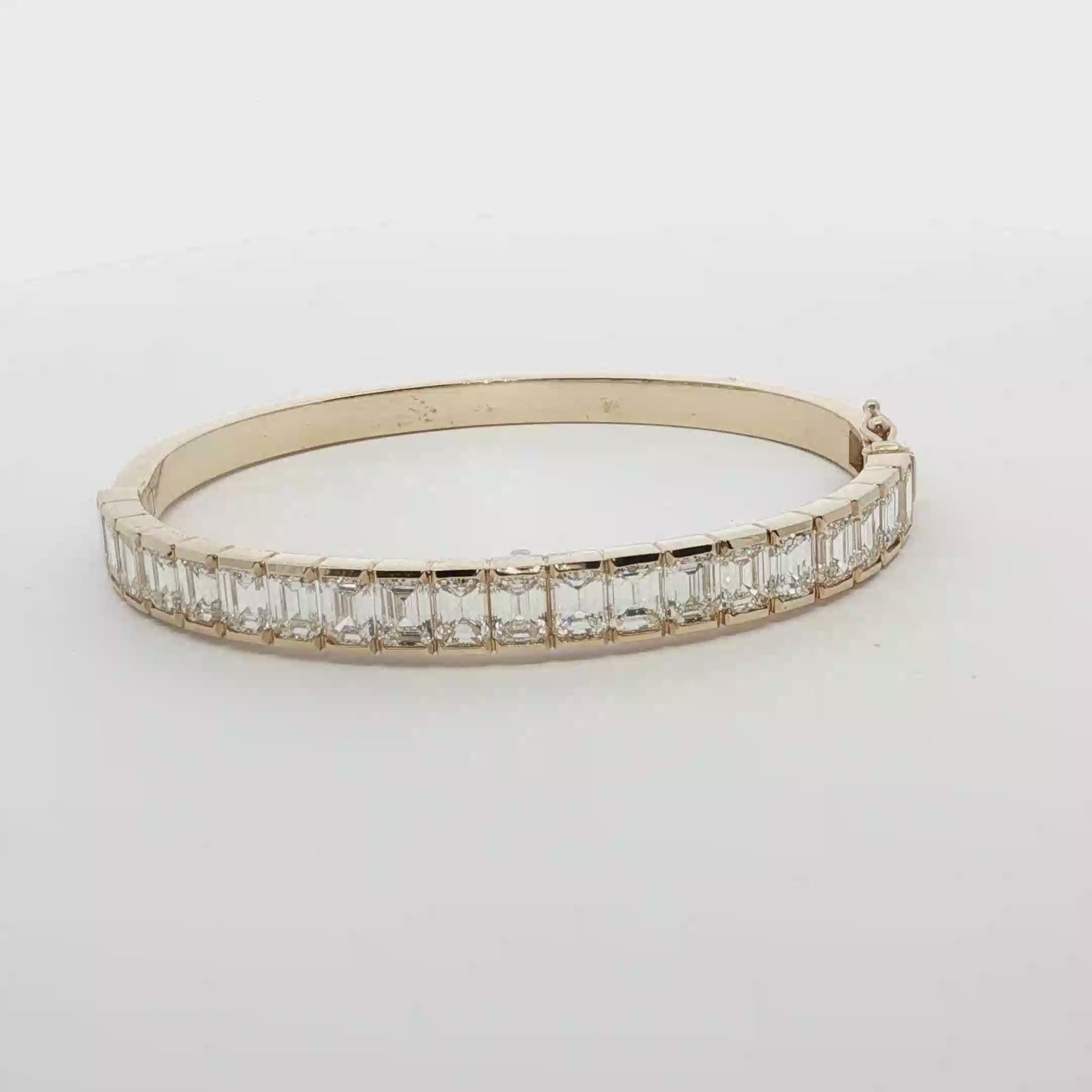 Elevate your style with this exquisite yellow gold bangle bracelet. Featuring 20 stones with 10.45 ct emerald-cut diamonds set in a step cutting style, this bracelet offers an elegant and sophisticated look. The timeless design and shimmering diamonds make it a perfect accessory for any occasion.