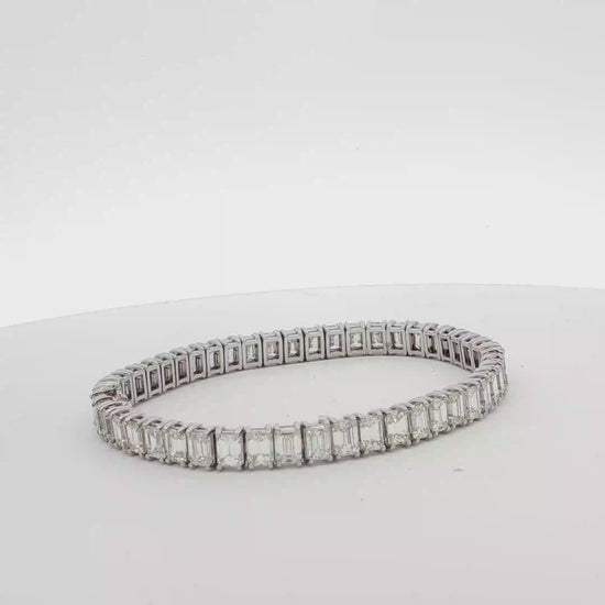 Exquisite white gold tennis bracelet featuring meticulously step-cut emerald shaped diamonds. The diamonds, known for their transparency and brilliance, are arranged in a seamless line, showcasing a continuous sparkle around the wrist. This elegant piece embodies sophistication and timeless style, perfect for adding a touch of luxury to any ensemble.