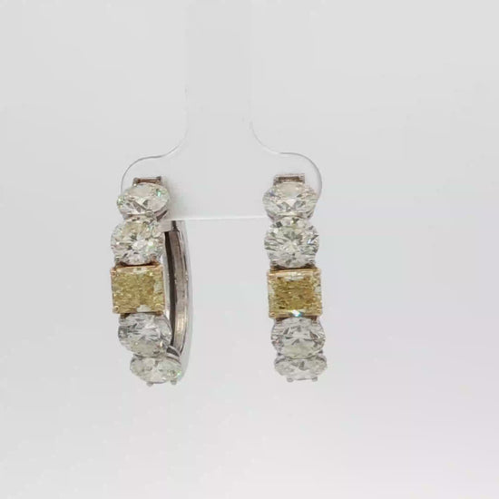 Elevate your style with these captivating white gold hoop earrings, each adorned with brilliant-cut, round shape diamonds and fancy Intense yellow diamonds. The diamonds boast exceptional transparency, clarity, polish, and symmetry, creating a mesmerizing sparkle. These earrings exude elegance and sophistication, perfect for adding a touch of glamour to any occasion.