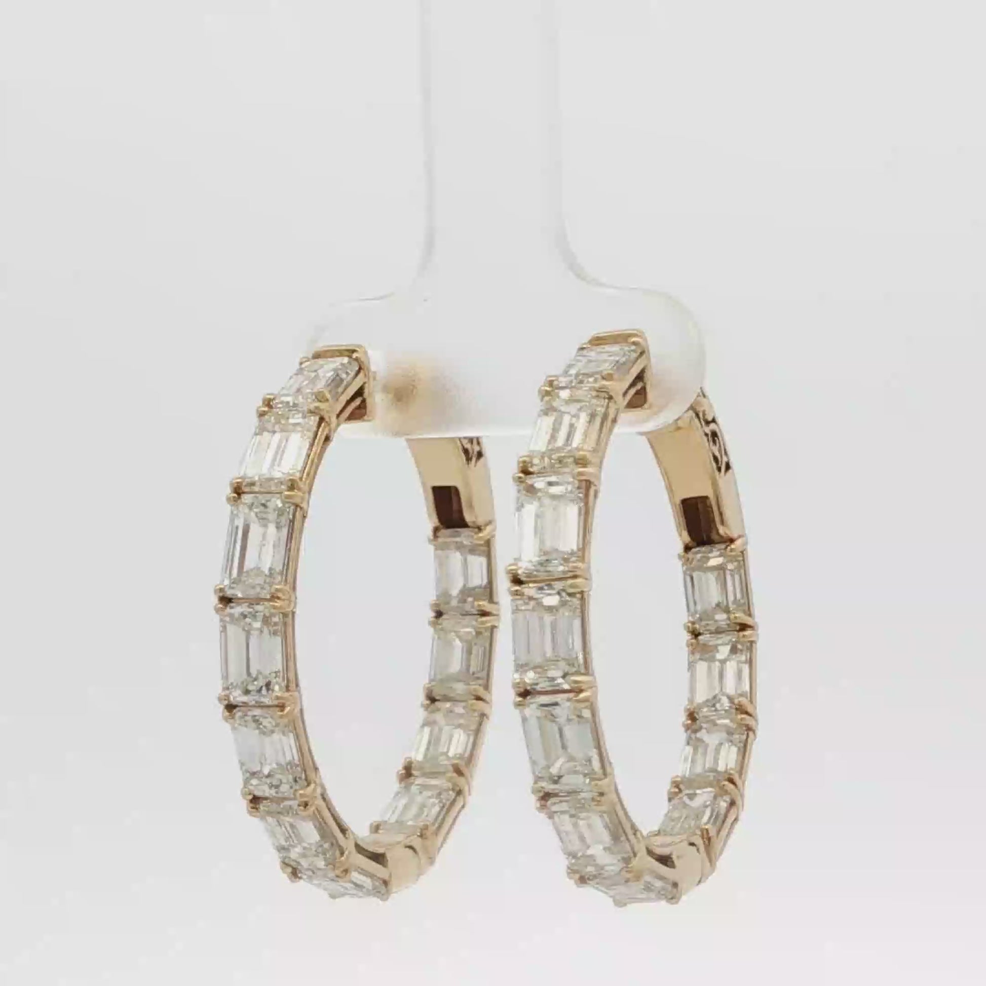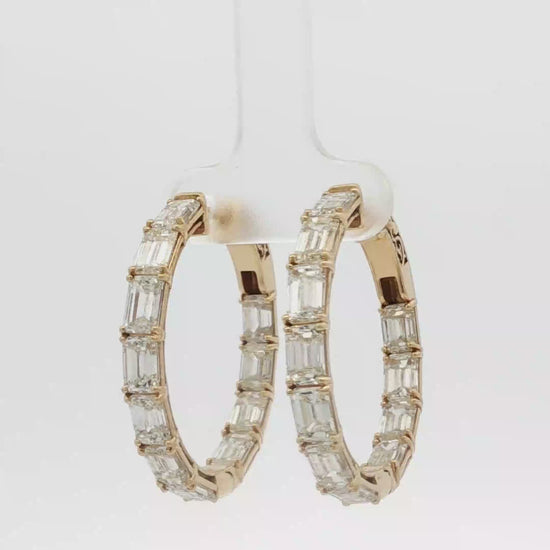 Elevate your style with these exquisite yellow gold hoop earrings, showcasing a dazzling array of emerald-cut diamonds in a step cutting style. Each diamond has been meticulously selected to ensure remarkable brilliance, radiating timeless sophistication and luxury. A captivating addition to any jewelry collection.