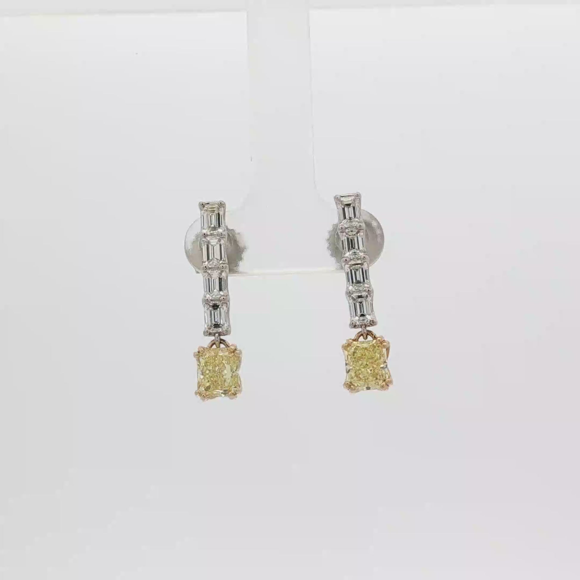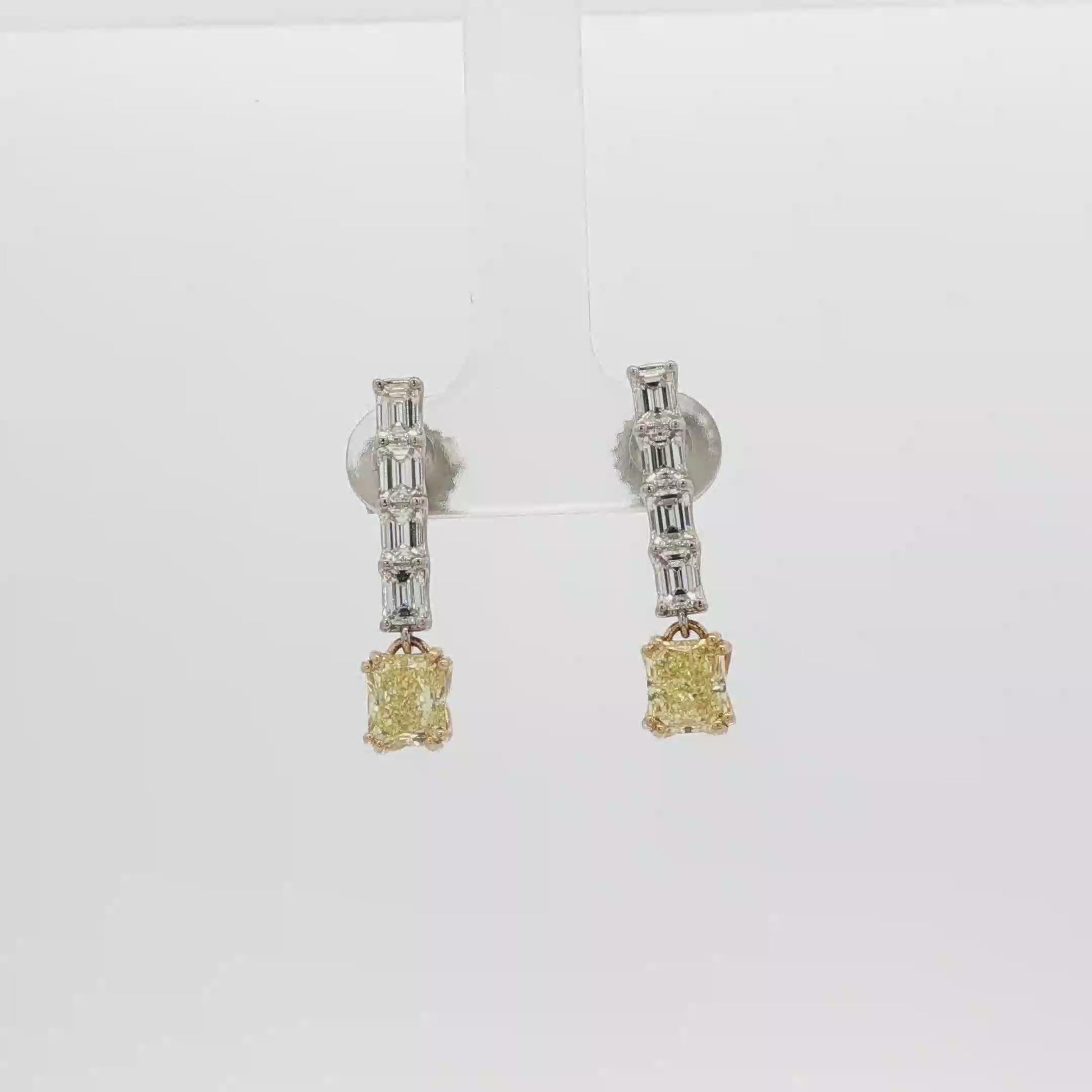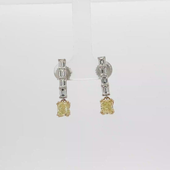 Elevate your ensemble with these exquisite dangle earrings, crafted in luminous white gold. Each earring showcases a mesmerizing fancy intense yellow Cushion cut diamond, exuding an aura of sophistication and charm. These earrings are a testament to refined taste and timeless elegance, perfect for adding a touch of luxury to any occasion.