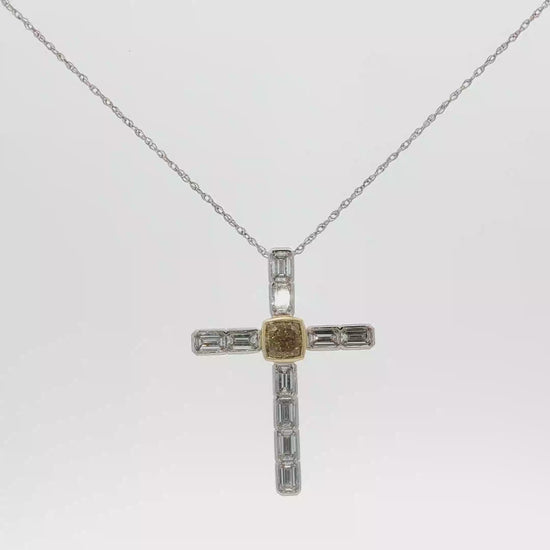 Elevate your style with this exquisite diamond cross pendant necklace, featuring a GIA fancy intense yellow square-shaped diamond at its heart. The mixed-cut diamond radiates a unique brilliance, set in a refined white gold frame. This piece offers a modern take on a classic symbol.